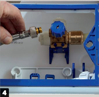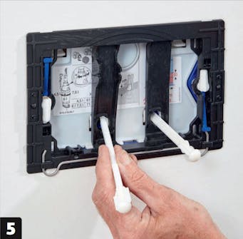 Adgang til cisternen sker ved at fjerne trykplade og plastkasse. Det afmonteres nemt med fingrene. Vandslangen tilsluttes til stophanen, og der kan nu åbnes for vandet, så cisternen fyldes.