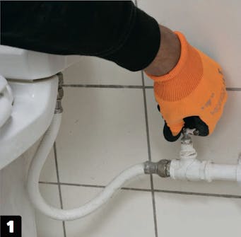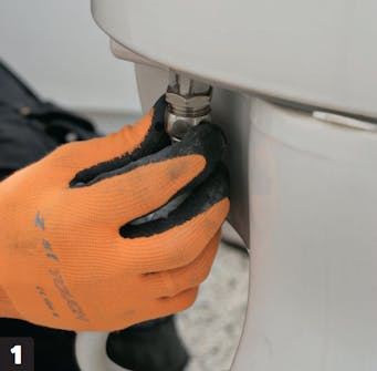 Start montagen med at sætte monteringsslangen på toilettet. Den skrues bag på toilettet, så det er praktisk, at den er på plads, inden toilettet sættes ind mod væggen.