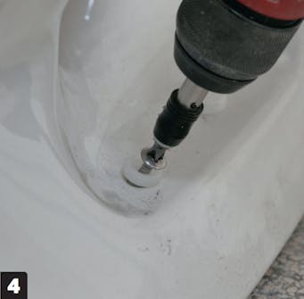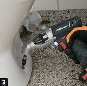 Næsten alle toiletter er skruet fast i gulvet med nogle store skruer. Er det svært at komme til med en almindelig skruetrækker, kan du sætte et vinkelhoved på skruemaskinen.