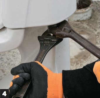 Her er monteringsslangen så god som ny, så den kan sagtens bruges igen på det nye toilet. Vi tager den derfor forsigtigt af ved hjælp af to svensknøgler, så vi kan holde kontra på toiletdelen.