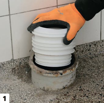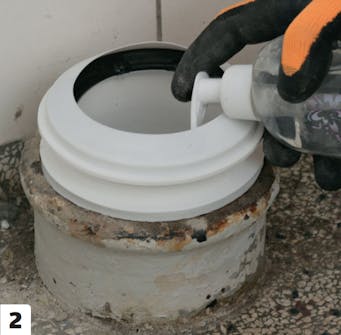 Når det gamle toilet er væk, og gulvet er renset, er vi klar til at gå i gang med det nye. Først renses flangen mellem faldstamme og toilet, og flangens gummipakning smøres med opvaskemiddel, så delene lettere kan glide sammen.