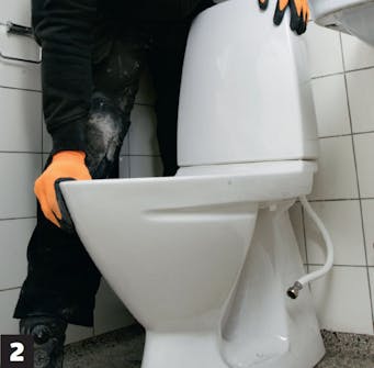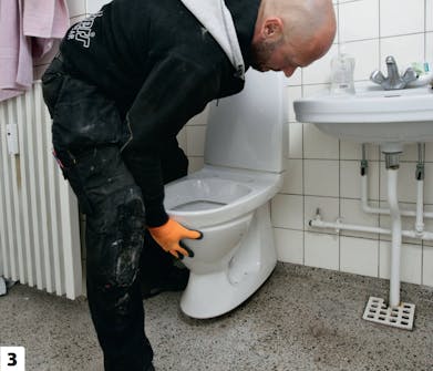 Vi lægger ud med at fjerne det gamle toilet, derpå monteringsslangen og så gulvskruerne, før toilettet er lige til at løfte af faldstammen.
