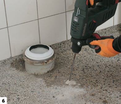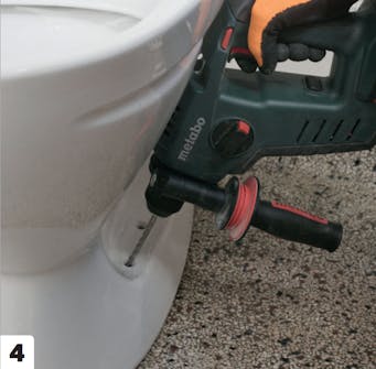 Markér, hvor der skal bores huller. Hvis du kan komme til med en borehammer, så bor for til plugs og skruer gennem hullerne i bunden af toilettet. Brug et tyndt murbor, 4-6 mm i første omgang.