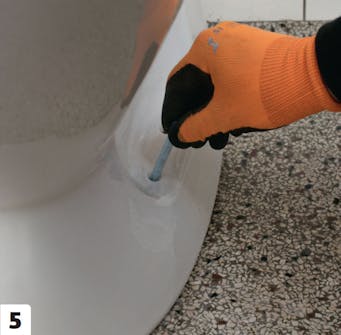 Tag nu de nye montageskruer, og skru toilettet fast. Når det er skruet ordentligt fast, sættes de medfølgende propper ned over skruerne.