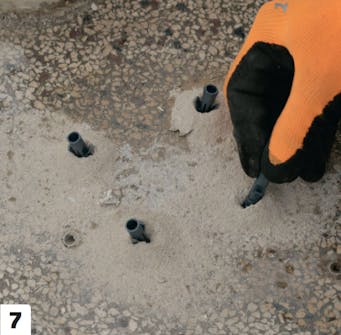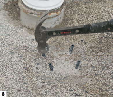 Inden du fjerner alt borestøvet, er det en god idé at skubbe nylondyvler halvt ned i alle hullerne. Når dyvlen sidder dernede, kan du feje snavset væk, uden at hullerne bliver fyldt med skidt.