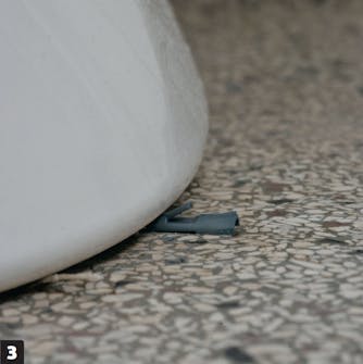 Flæk to nylonplugs på langs, og skyd dem ind under toilettet. Der skal være en halv plug ved hver skrue, hvor de fungerer som en slags gummipakning, så toilettet ikke står direkte oven på flise- eller betongulvet.