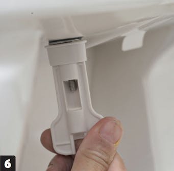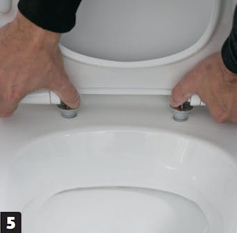 Montér sædet. Tryk det fast i hullerne nær cisternen. Det skal føles let og enkelt, som om sædet passer som fod i hose.