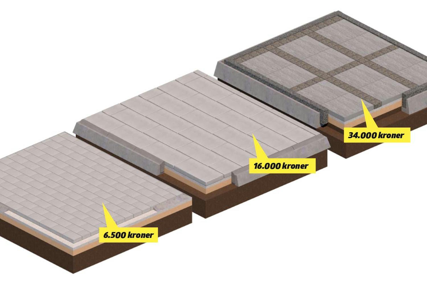 Her får du en beskrivelse af 3 forskellige belægninger på 30 m², så du kan se, hvad du får for pengene, alt efter hvad du vælger: