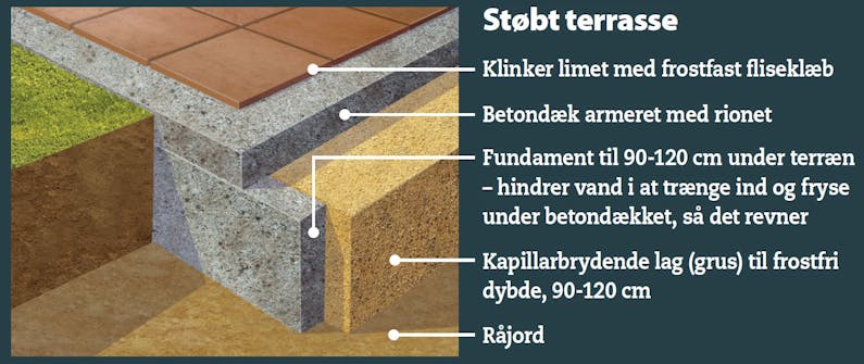 Du investerer i fremtiden, når du opbygger bunden under en fliseterrasse. I første omgang vil ingen opdage det, hvis du ikke stamper lagene godt nok eller bruger læggegrus i bærelaget, men i længden betaler det sig at skabe et solidt skelet af sten, grus og beton efter alle kunstens regler. Det sikrer, at den flotte belægning af fliser eller sten holder sig flot i mange år. Det gør det lettere at passe belægningen, fordi de tætte fuger holder ukrudtet væk - og det gør det oven i købet nemt en dag at skifte de synlige sten på overfladen.