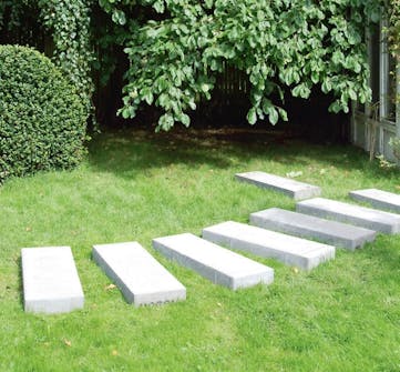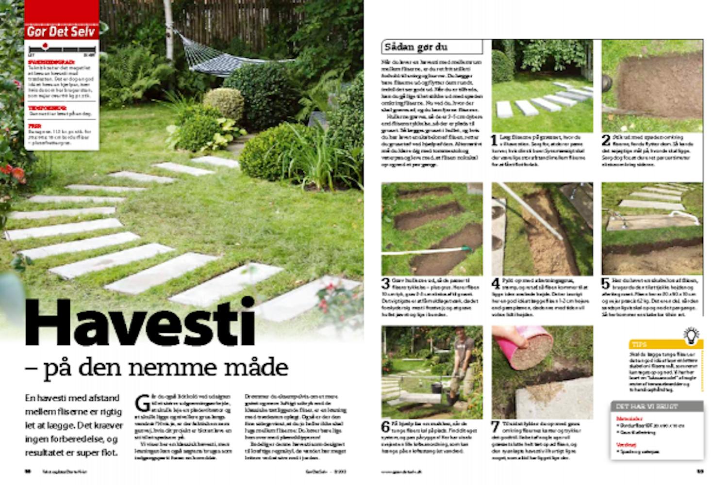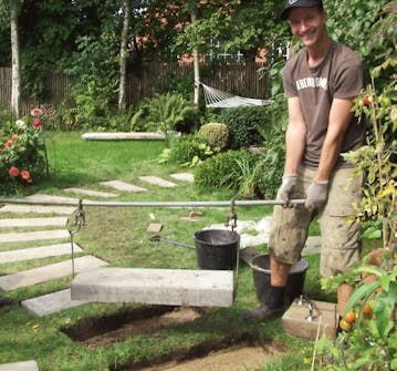 Teknisk set er det meget let at lave en havesti med trædesten. Det er dog en god idé at have en hjælper, især hvis du som her bruger sten, som vejer over 60 kg pr. stk.