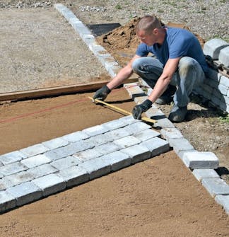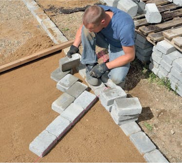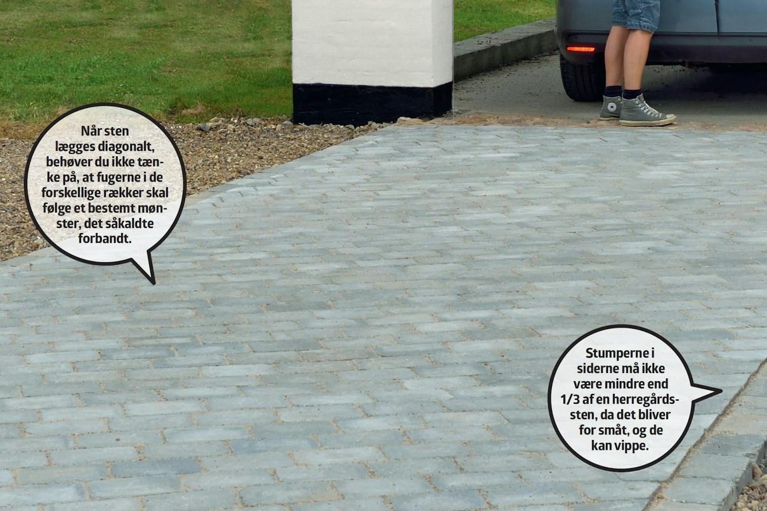 Spænd en snor ud diagonalt på kantblokkene, så stenene kommer til at ligge skråt i indkørslen. Læg et par sten i den første række langs snoren og tre sten mere ved siden af den første, så du ved, hvor meget fire rækker sten fylder, et såkaldt modulmål. Det sikrer, at du får samme fugebredde mellem alle rækker sten.