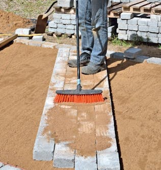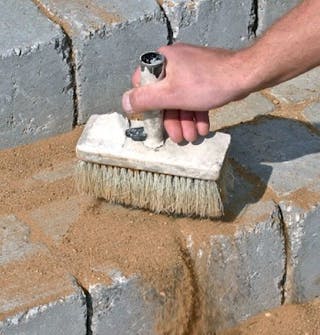 Der fuges løbende med fugegrus, når du lægger sten på et stort areal som en indkørsel. Så undgår du, at stenene vipper, hvis du går på dem. Fortsæt med at lægge sten på denne måde, til alle hele sten mellem kantblokkene er lagt.