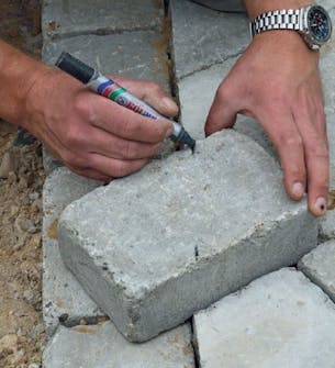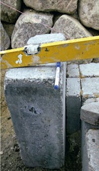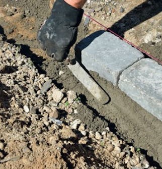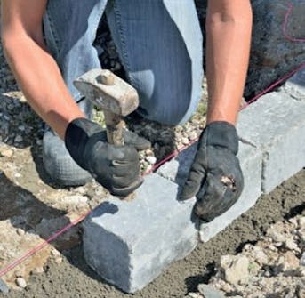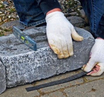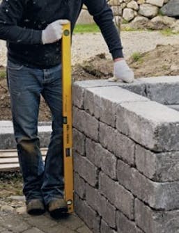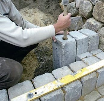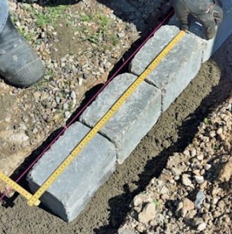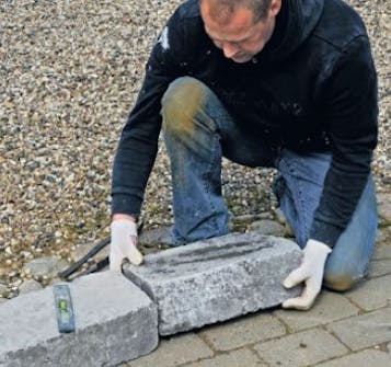 Tjek, at kantblokkenes modulmål holdes, dvs. at målet på fx tre kantblokke er det samme hele vejen. Så bliver kanten ensartet med samme fugebredde. Tjek også, at kantblokkene står lige med et vaterpas oven på stenen.