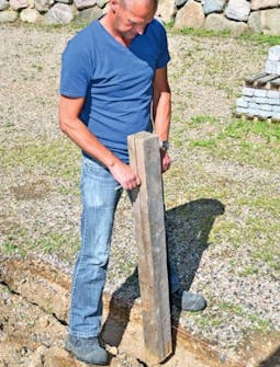 Grav en rende, hvor kantsikringen skal være, og stamp den godt i bunden, så den er kompakt. Det kan du gøre med en brolæggerjomfru. Renden skal være ca. 10 cm bredere end dine kantblokke på begge sider, så der er plads til beton.