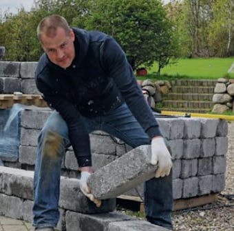 Læg de næste rækker sten, når den første er på plads. Stenene lægges med halvforbandt, hvor den næste række forskydes med en halv sten.