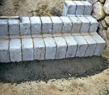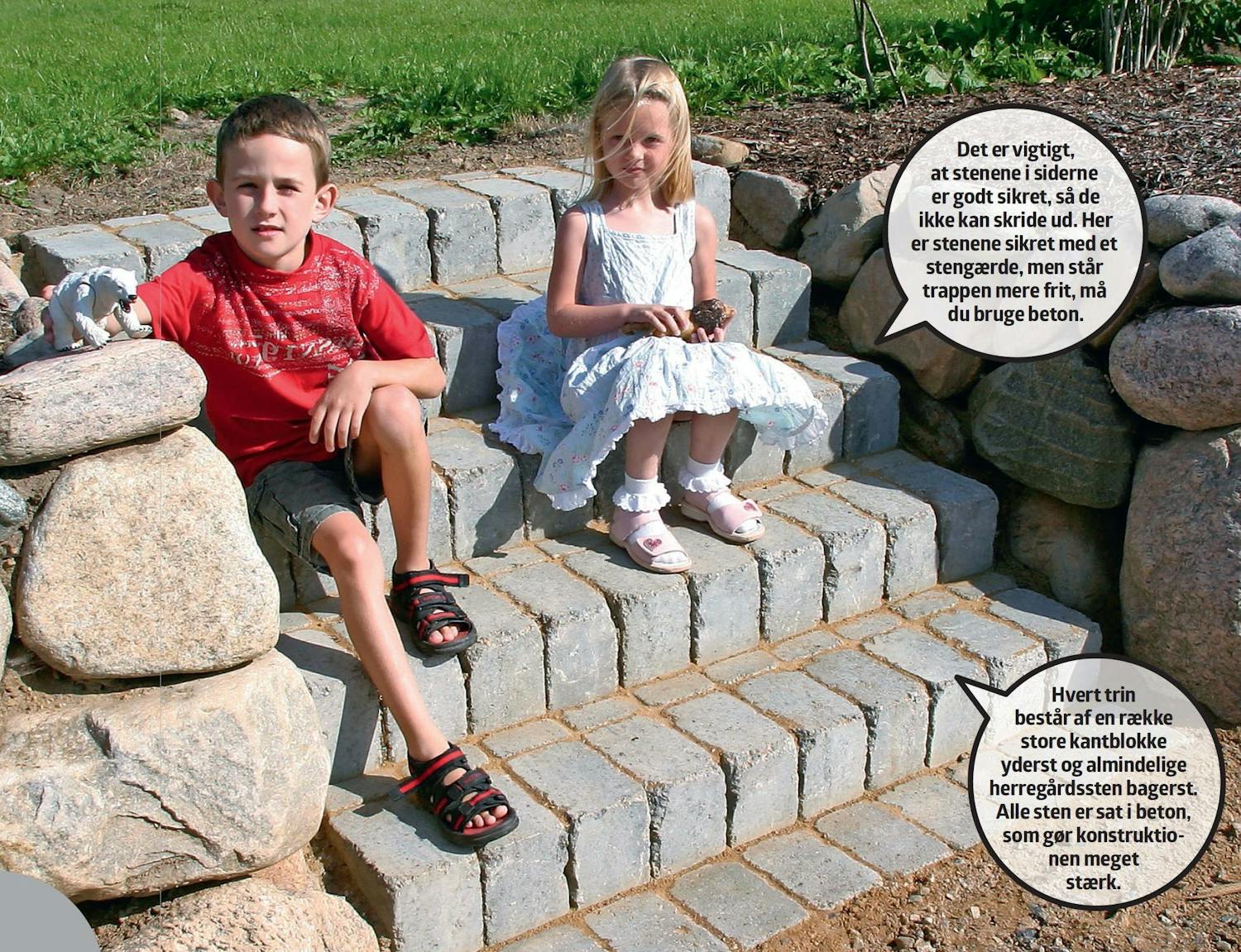 Første stødtrin støbes fast. Placér kantblokke på højkant, og lav en såkaldt trekantstøbning i jordfugtig beton, der måler 15 x 15 cm.