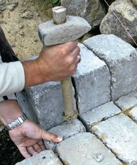 Næste stødtrin sættes fast i beton. Bank stenen på plads. Tjek, at de store sten har samme højde. Tjek også, at der er plads til en lille sten mellem de store.