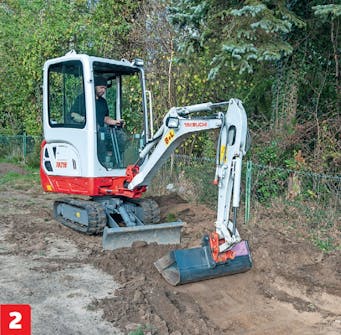 Her skal vi lægge græsarmeringsmåtter ud på et stort område, så det er oplagt at bruge en minigraver til gravearbejdet. Den skåner kroppen og sætter tempoet voldsomt i vejret.