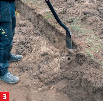 Stik kanten ren med en spade, når minigraveren har gjort det hårde arbejde. Sørg for at grave 10-15 cm af uden for det opmærkede areal, så der er plads til beton, der skal sikre kantstenene på ydersiden.