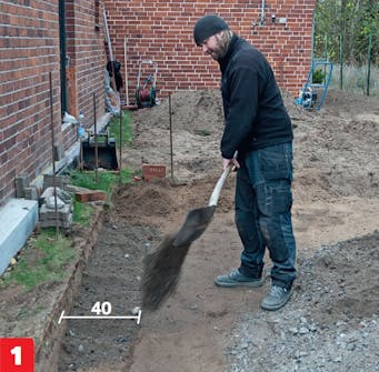 Grav ca. 40 cm ned i hele det afgrænsede område, så der bliver plads til både bærelag (ca. 30 cm), afretningslag (4-5 cm) og armeringsmåtter (ca. 4 cm).