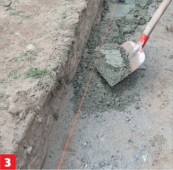 Læg et lag beton langs kanten. Det skal være så fast, at stenene ikke synker, og så du kan forme en kant på for- og bagsiden. Brug murersnoren til at kontrollere højden.