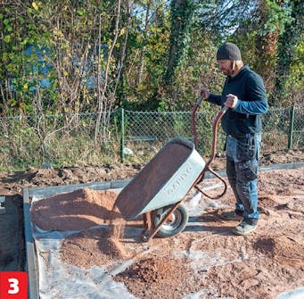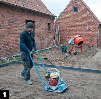 Nu er det tid til afretningslaget. Det skal være 4-5 cm tykt og bestå af små skærver blandet med muldjord. Når det er fordelt og planet, komprimeres det med pladevibratoren.