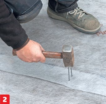 Fiberdugen fikseres med fæstningskroge som her eller stålspyd, der bankes ned med passende mellemrum.