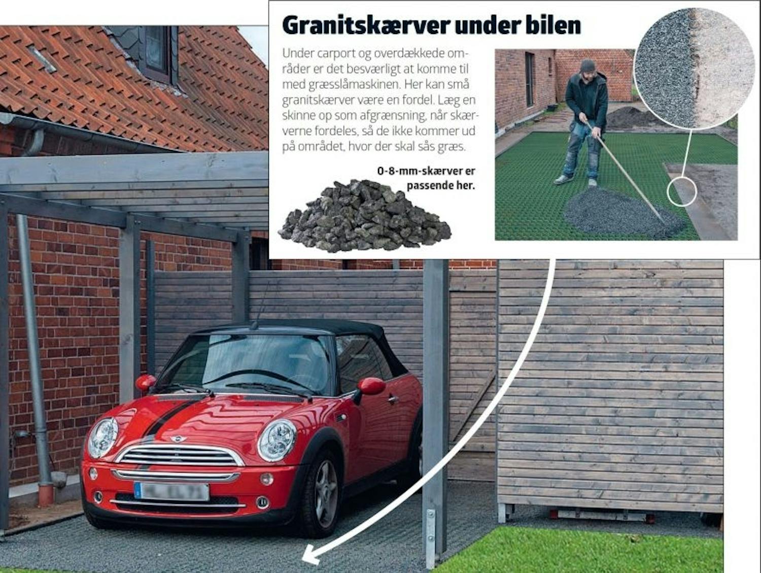 Når kantsikringen er hærdet, kan du fortsætte med det 30 cm tykke bærende lag af skærver. Skærver er knust materiale, der har plane flader og skarpe kanter. Det betyder, at skærverne pakker og “låser” bedre end bundsikringsgrus, der består af sten med afrundede kanter.