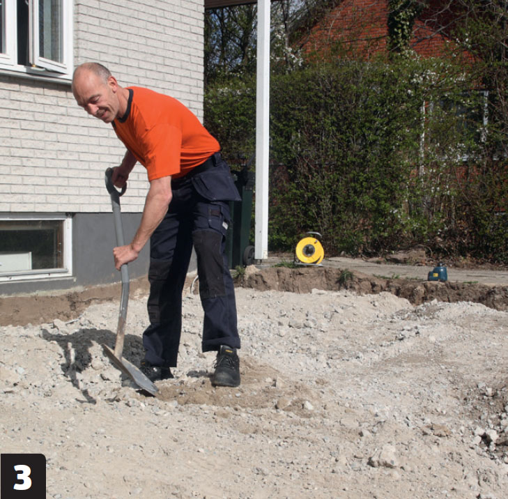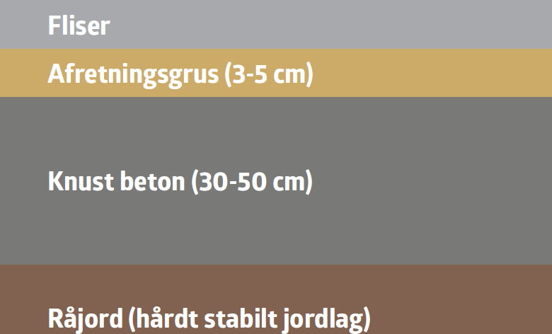 Når muldjorden er væk, skal du bygge en ny, solid bund op. Det traditionelle materialevalg til bundlaget er stabilgrus, men du kan også bruge knust beton som os. Når betonlaget komprimeres med en god pladevibrator, bliver bunden nemlig ekstra hård. Og husk, at der også skal laves fald på betonunderlaget, så det efterfølgende lag afretningsgrus bliver lige tykt over det hele.