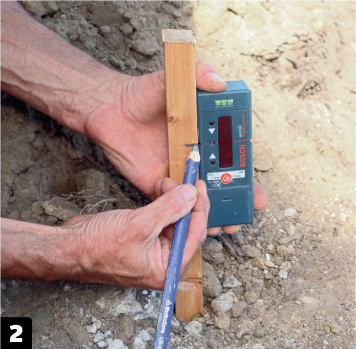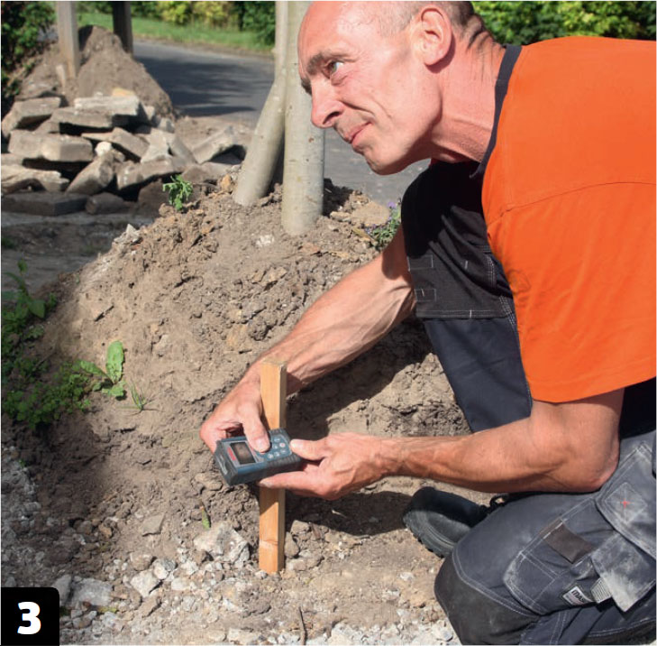 Afsæt indkørslens højde på pælene, så du har et måleplan. Vi måler op med en rotorlaser og en detektor. I mørke kan det røde lys fra rotorlaseren ses direkte. Når det ikke er tilfældet, må du bruge en detektor.
