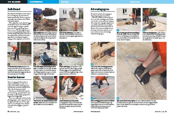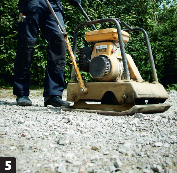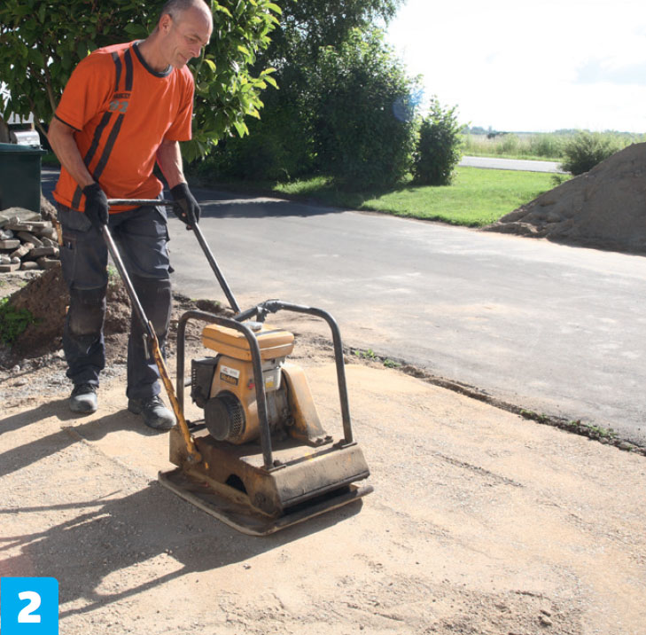Vibrér afretningsgruset, og kør det over med en pladevibrator flere gange, til det er så kompakt, at du knap efterlader fodspor, når du går på det. Det sætter sig ca. 1 cm, når det vibreres.