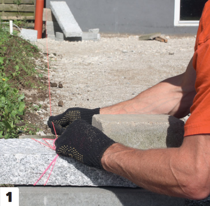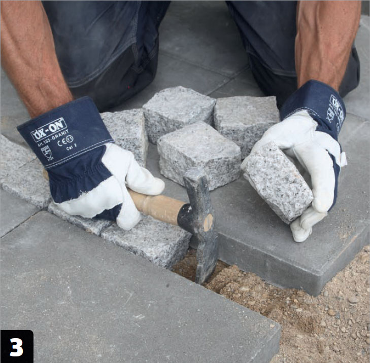 Grav granitstenene lidt ned i afretningsgruset. Med den ene ende af en murhammer kan du grave og justere højden på gruset til granitstenene, der varierer lidt i højde. Med den anden bankes de på plads.