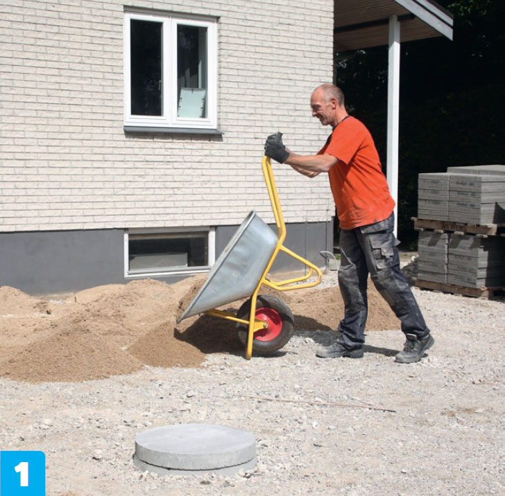 Kør afretningsgrus på betonunderlaget. Fordel det, og jævn det ud. Gruslaget skal være 3-5 cm og have en overhøjde på ca. 2 cm, da det bliver mindre, når det komprimeres. Kontrollér højden.