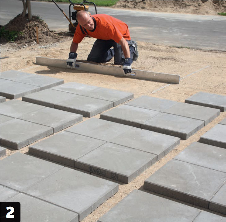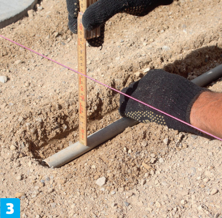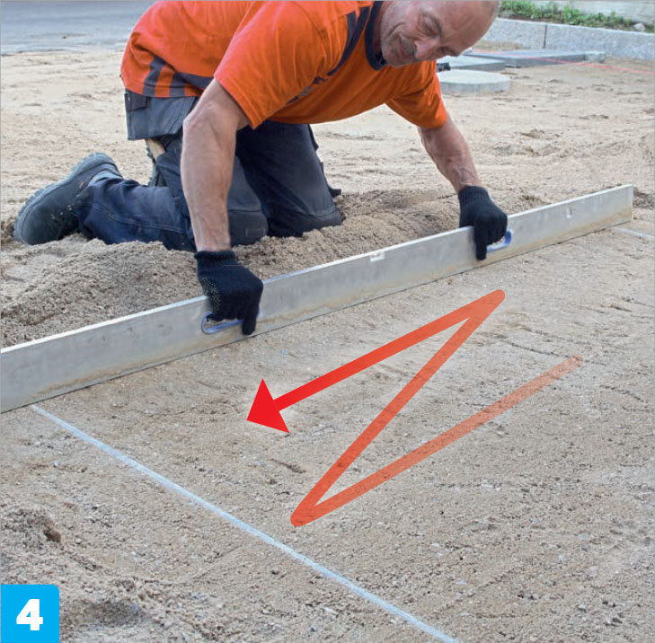 Når hele området er vibreret, graver du to rør ned i underlaget, som du kan rette af efter ved at trække en retskinne eller et lige bræt i zigzagbevægelser hen over. Rørene skal placeres i en dybde, så deres overkant svarer til bunden af fliserne. Det er nemt at tjekke rørenes placering, hvis du har spændt murersnor ud, der markerer den færdige højde på belægningen.