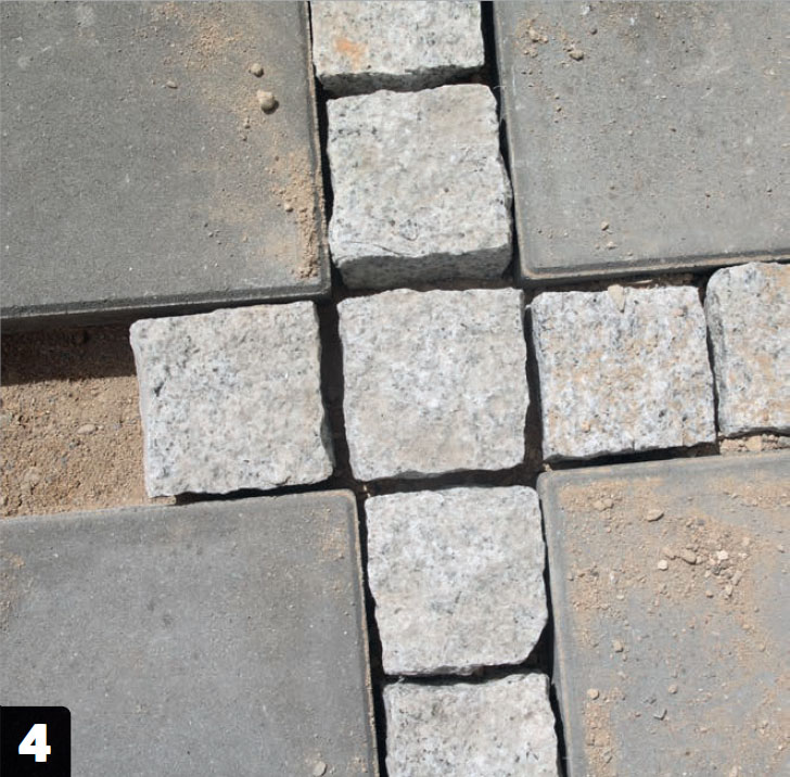 Sørg for, at der ligger en hel granitsten midt i krydset mellem de lodrette og vandrette rækker af små sten. Så holder rækkerne en lige linje i begge retninger.