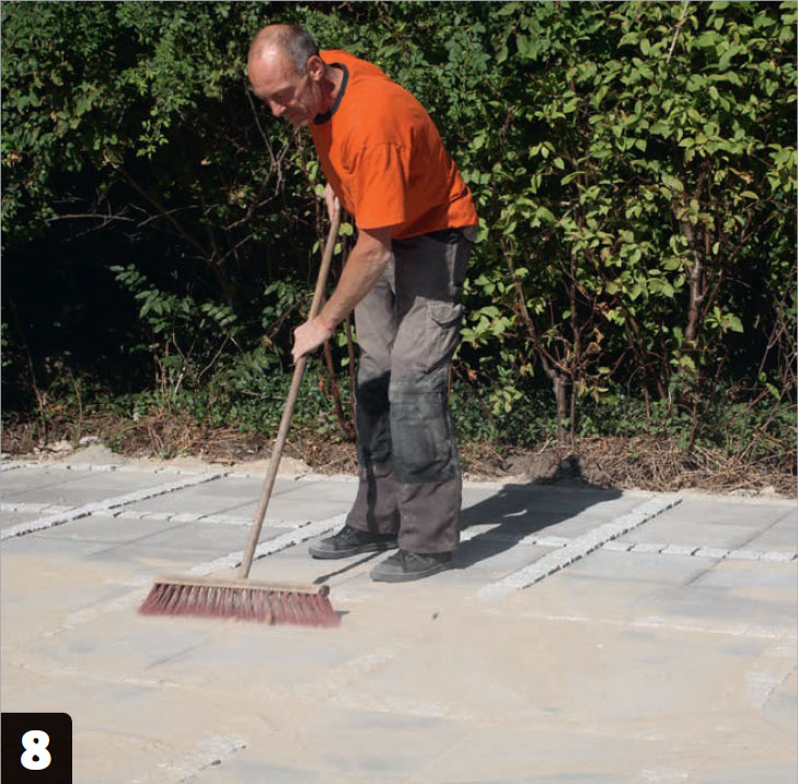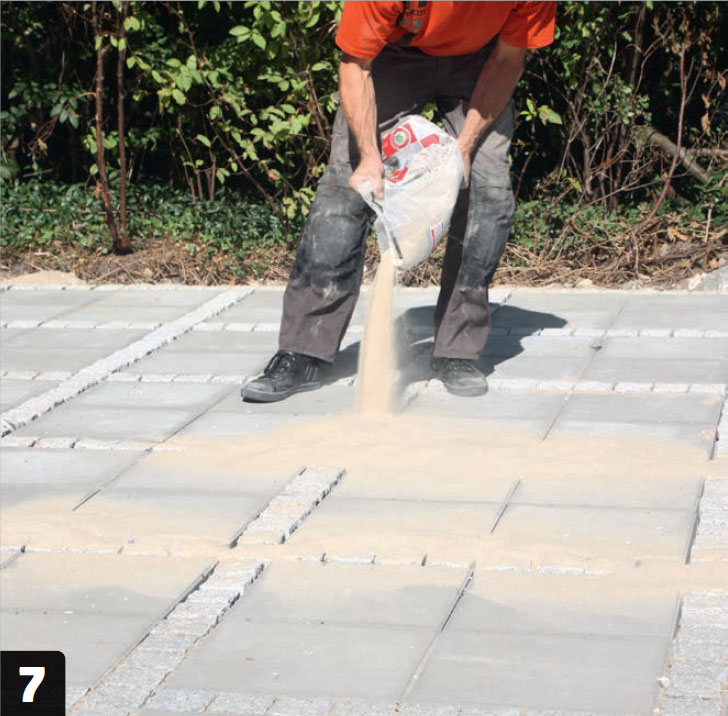 Fyld fugesand i fugerne. Det er vigtigt, at du bruger rigtigt fugesand. Det er specielt sammensat af kantede korn i forskellige størrelser, som sikrer, at fliserne låses fast, og fugerne bliver kompakte.