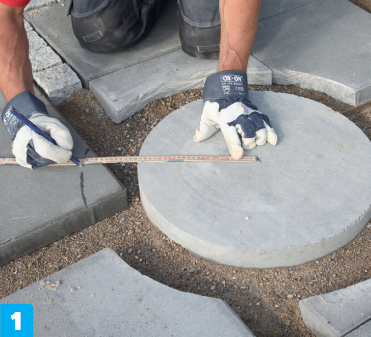 Mål op, hvor betonfliserne skal skæres til, så der bliver plads til en række små granitsten langs alle kanter. Det ser ikke bare godt ud, men giver også mulighed for at udligne små højdeforskelle.
