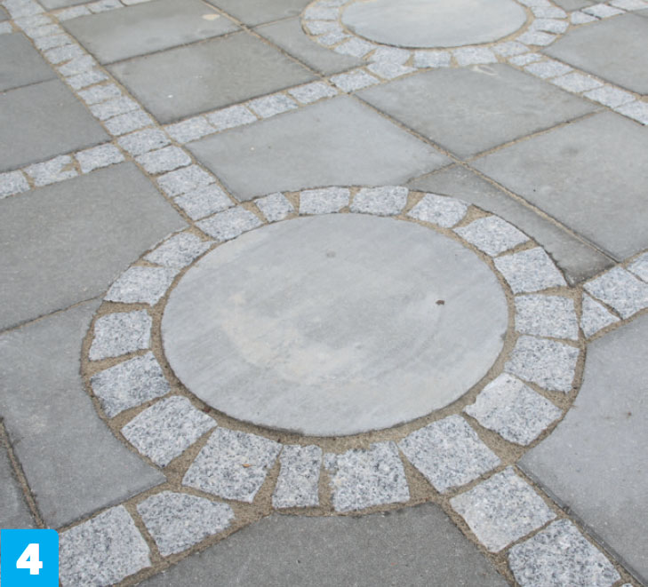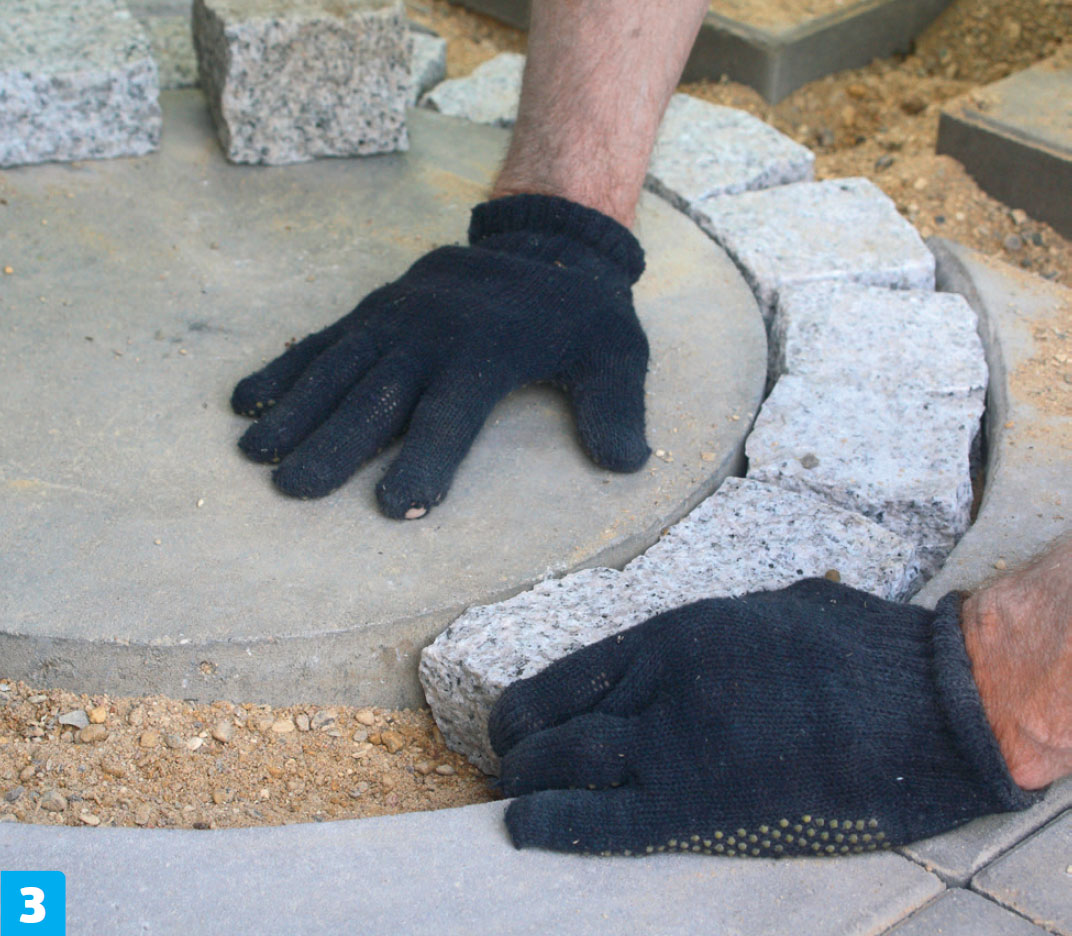Læg de små granitsten langs alle kanterne. Hvis granitsten lægges i buer, skal du være opmærksom på at vende dem, så hver enkelt peger ind mod centrum af det runde, fx et betondæksel.