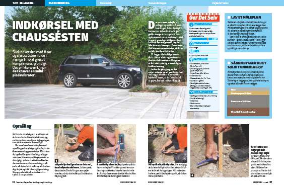 Der laves en overgang mellem indkørsel og vej med granitsten. Ved at sætte tre rækker lidt skrånende ved siden af hinanden laves en opkørsel til indkørslen. Stenene bankes ned i en blanding af tørbeton.