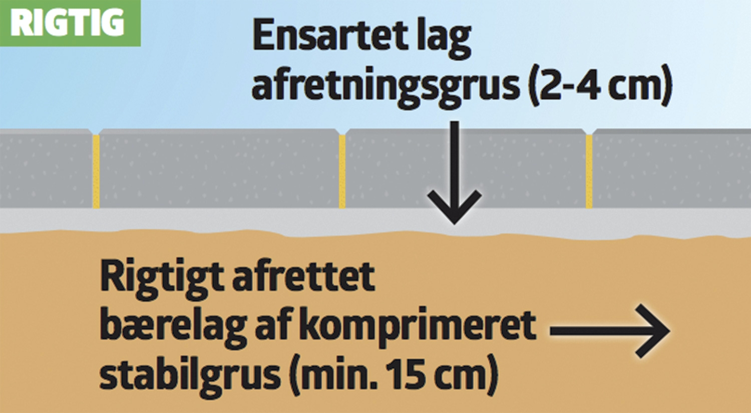 2. Når det nødvendige antal sten er pillet op, fjernes afretningsgruset helt ned til bærelaget. Det er let at se forskel, da bærelaget er fyldt med sten. Har bærelaget sat sig, rettes op og stampes.
