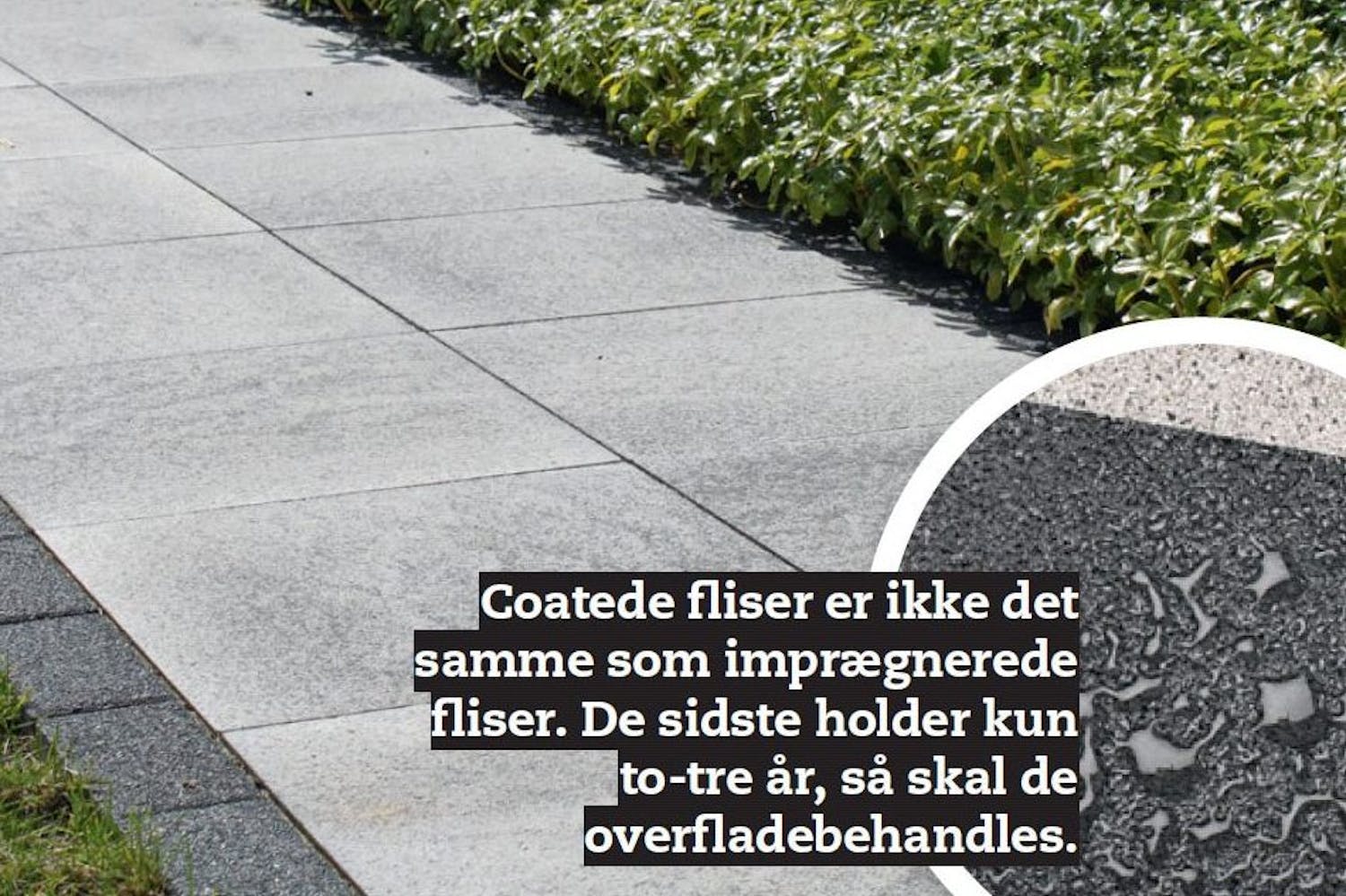 Du kan købe fliser, som ser ud som granit, men til en brøkdel af prisen. Og du kan få fliser, som ligner sandsten eller marmor, men som i modsætning til disse kan tåle både frost og sne. En stor fordel ved disse fliser er, at de er coatede - det vil sige overfladebehandlede, så de ikke er så modtagelige for alger og mos, som almindelige fliser er.