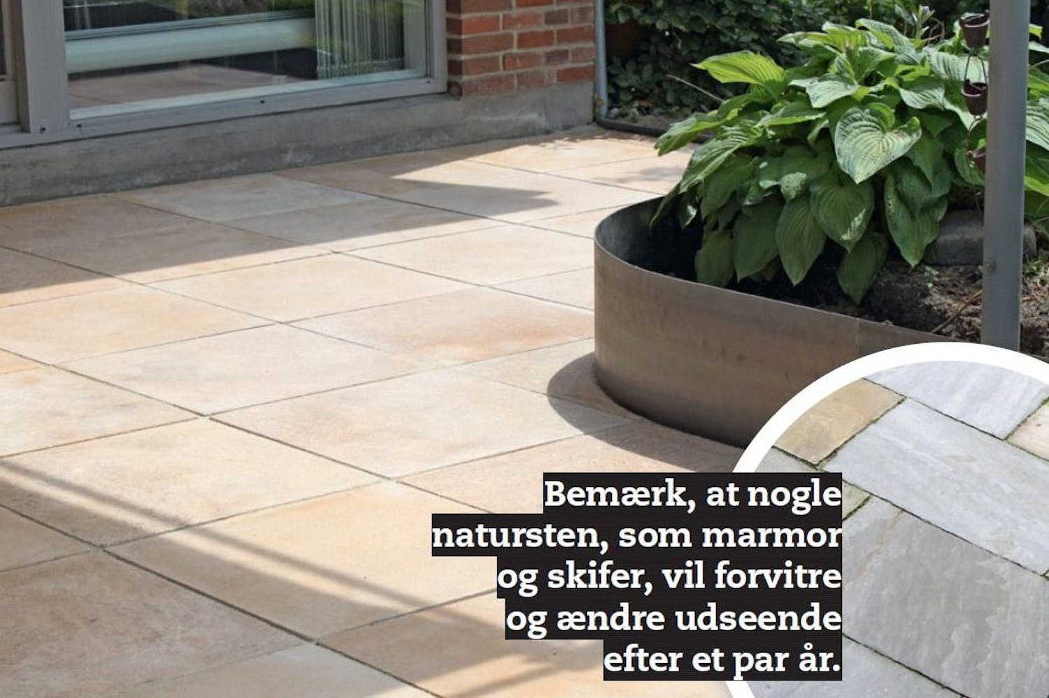 Du kan købe fliser lavet af forskellige slags natursten, men du skal huske på, at vores klima med meget vand og indimellem frost og sne kan slide voldsomt på visse af stenene.