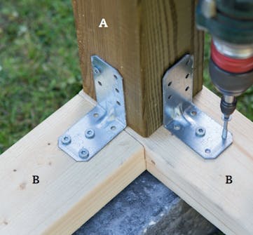 I hvert hjørne rejses en stolpe (A). Hver stolpe fastgøres til remmene (B) med to vinkelbeslag med forstærkning. TIPS: Du kan lette arbejdet ved at sætte stolpen op på plads, mærke siderne af - og fjerne stolpen, mens beslagene gøres fast.