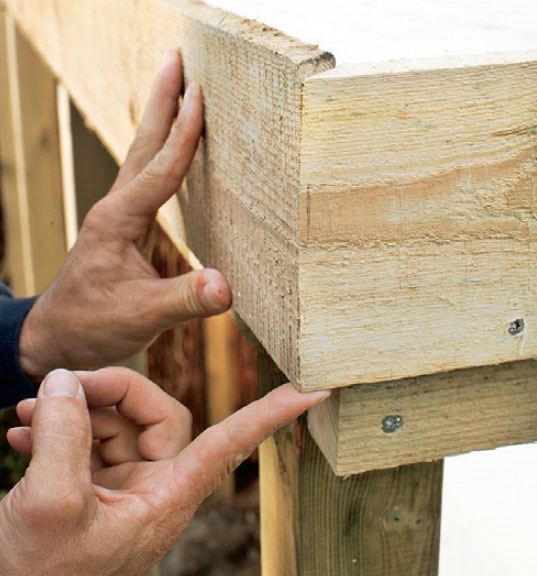 Skær ud til bladsamling i stolperne (A1-A3) til det yderste spær (B3). Lav et hak ind, der er så dybt, som spæret er tykt. Stolpen skal kortes af. Kort den af 1 cm under spærets overkant.