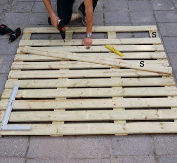 Byg bunden af terrassebrædder (S). Til vores skur passer det med 12 gulvbrædder og 4 afstivningsbrædder. Inden samling, der foregår med 4 x 40 mm skruer, skal du tjekke, at bunden er i vinkel. Brug to skruer pr. samling.