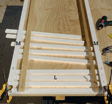 Døren samles på en vinkelret plade. Start med at gøre listerne (L) fast til yderrevlerne (M). Her kan du genbruge målepindene fra side modulerne (med 7 cm mellem hver streg). Listerne skrues på med 4 x 40 mm skruer.