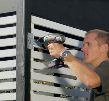 Skru bagsidemodulet fast til stolperne. Brug 5 x 70 mm skruer, og skru dem i inde fra skuret. Vi anbefaler fem skruer: en skrue tæt på toppen, en skrue tæt på bunden og yderligere tre skruer.
