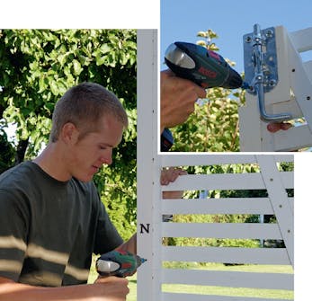 Skru de to hængsler fast til stolperne. Klods den ene dør op, og fikser den med spændetvinger. Skru hængslerne fast til døren med 4 x 20 mm skruer. Gentag processen med den anden dør.