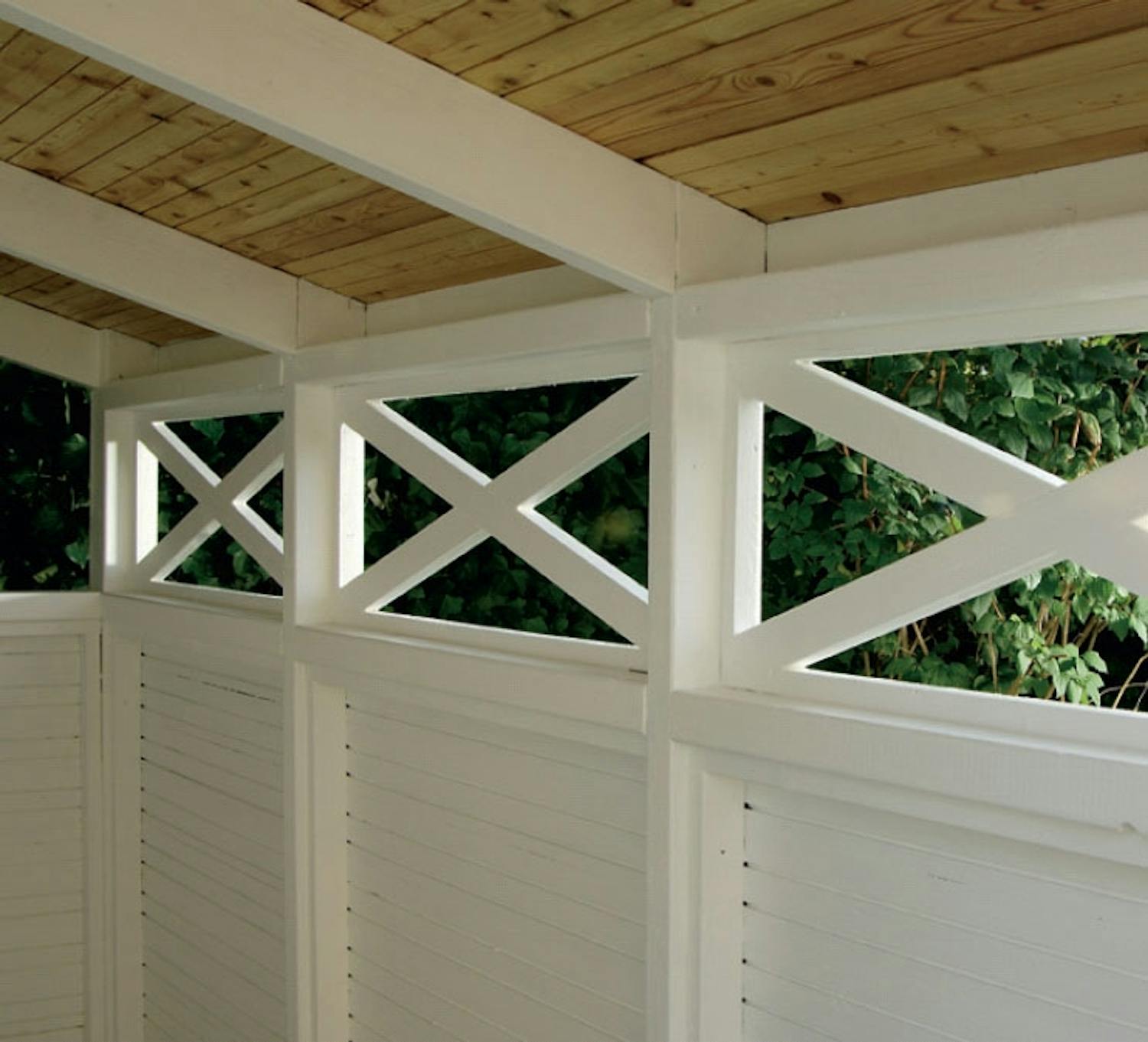 Vinduesrammerne med kryds i er prikken over i’et i cykelskuret. Den fine detalje kaster masser af lys ind i skuret og giver samtidig skuret en dejlig lethed. Krydsene skal selvfølgelig samles af lister i perfekte diagonaler fra hjørne til hjørne, hvilket stiller krav til omhyggelig opstreg-ning og koncentration under savning og samling. Det er ikke her, man skal skynde sig.