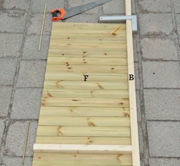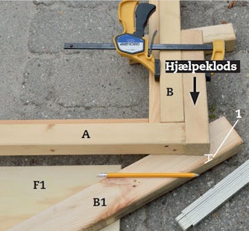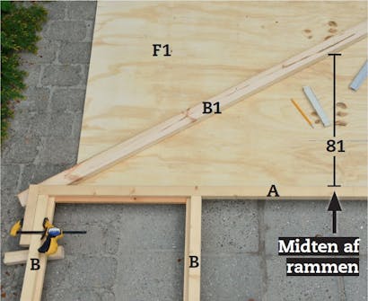 Mål op til spærene. Centrer pladen til gavlbeklædningen (F1) over den forreste ramme. Mål 81 cm op fra midten af rammen - så bliver taghældningen 30 grader. Læg den ene del af gavlspæret (B1) ud, og marker, hvor det skal kortes af. Sav så spæret til.
